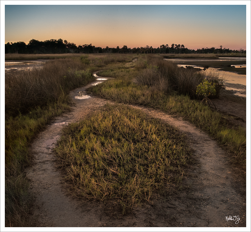 Last week, I was drawn to our local fishing pier by the knowledge that the moon would be setting toward the pier, shortly after sunrise and at low tide. So there I was, in the half-dark on a finger-numbing February morning, no sound save the soft Gulf breeze, gingerly stepping through the wet marsh to find a pleasing composition. For just a moment, I was visited with child-like simplicity and wondered. Is the tide following the moon over the western horizon or is it the other way around, the moon being dragged by the receding tide? Or are they locked in a celestial dance with neither leading, both just drifting away to the west?