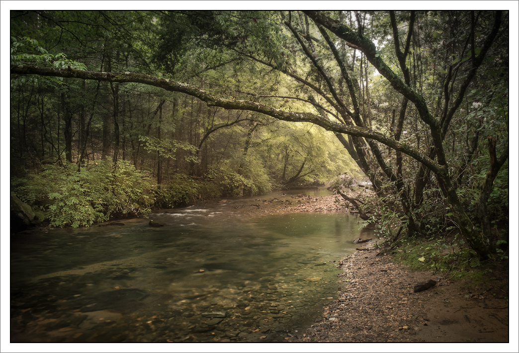 It was close to 10 am and I was desperately looking to extend my morning here in the wooded mountains of Appalachia. But I knew that the sun was close to breaking through the soft mist left by a soaking overnight rain. Tripod and attached camera slung over my shoulder, with the camera strap looped over my head just in case the camera came loose (it’s happened before), I headed downhill on the dirt road following Dick’s Creek toward its next waterfall.