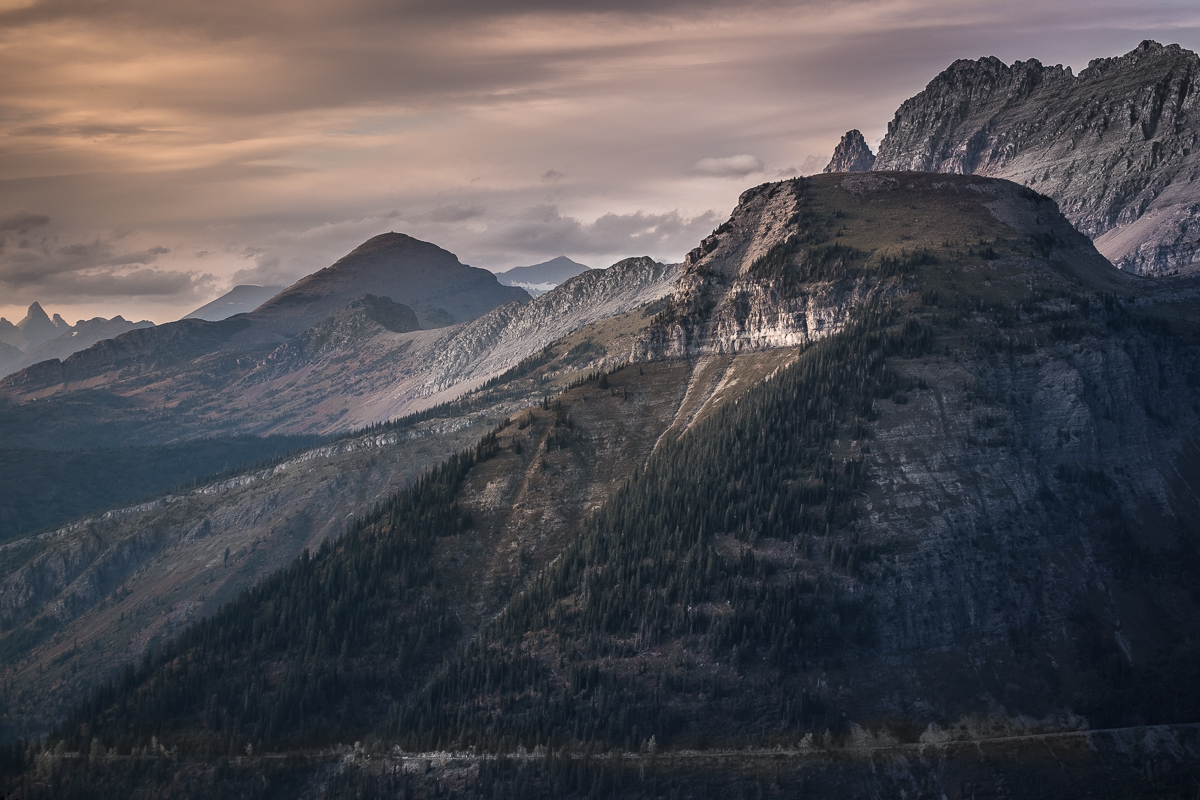 This week was about Montana and my first-timer impressions. Montana is about tawny folded hills, soaring rough-hewn mountains, remote gravel roads, pastured horses, log cabins and clear energetic streams hurrying out of the hills onto honey-grass flats. It is also about Glacier National Park and the Going to the Sun Road – the harrowing narrow rock-cut path that traverses the park, crossing the Continental Divide in the process. I did the driving on the way up, uncomfortably hugging the inside, knuckles white. The road down from the Divide to the other side of the park was closed for the season, so we came back down the way we had gone up, and right at sunset. I made this image as we paused at the top, delaying the return trek as long as possible.
