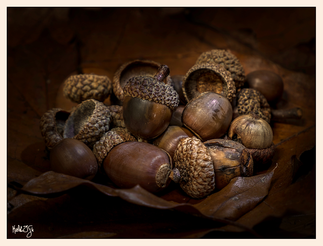 So many acorns. They’ve been raining on us for three weeks now. Machine gun spatter announcing the wind. And when it’s calm, a sudden sharp crack…cartwheeling down the roof…short pause to catapult to the deck and gone. And repeat. I decided to do a formal portrait of the acorn, to celebrate this year’s crop, which I understand will make the deer very happy.